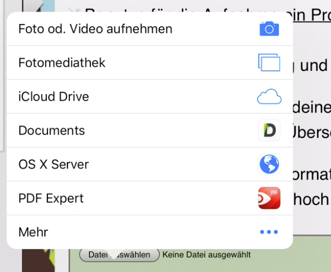 Natürlich kann man oben auf „Video aufnehmen“ tippen und z.B. eine Aufnahme an Ort und Stelle vornehmen. Will man ein Text-Dokument hochladen, scheint es zunächst gar keine Möglichkeit zu geben.