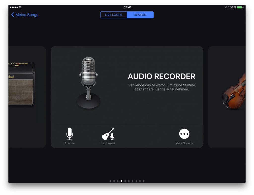 Die Standard-Audiosoftware auf dem iPad ist GarageBand – perfekt geeignet für einfache Tonaufnahmen (und auch für wesentlich komplexere Dinge – wer Spaß am Musik machen oder Mixen hat, kann sich hier austoben).