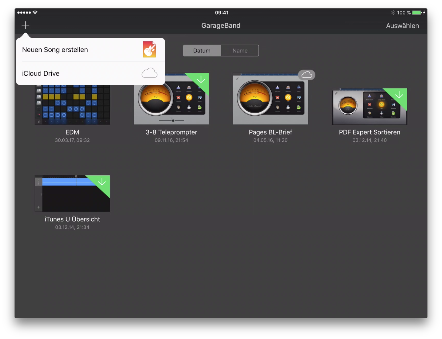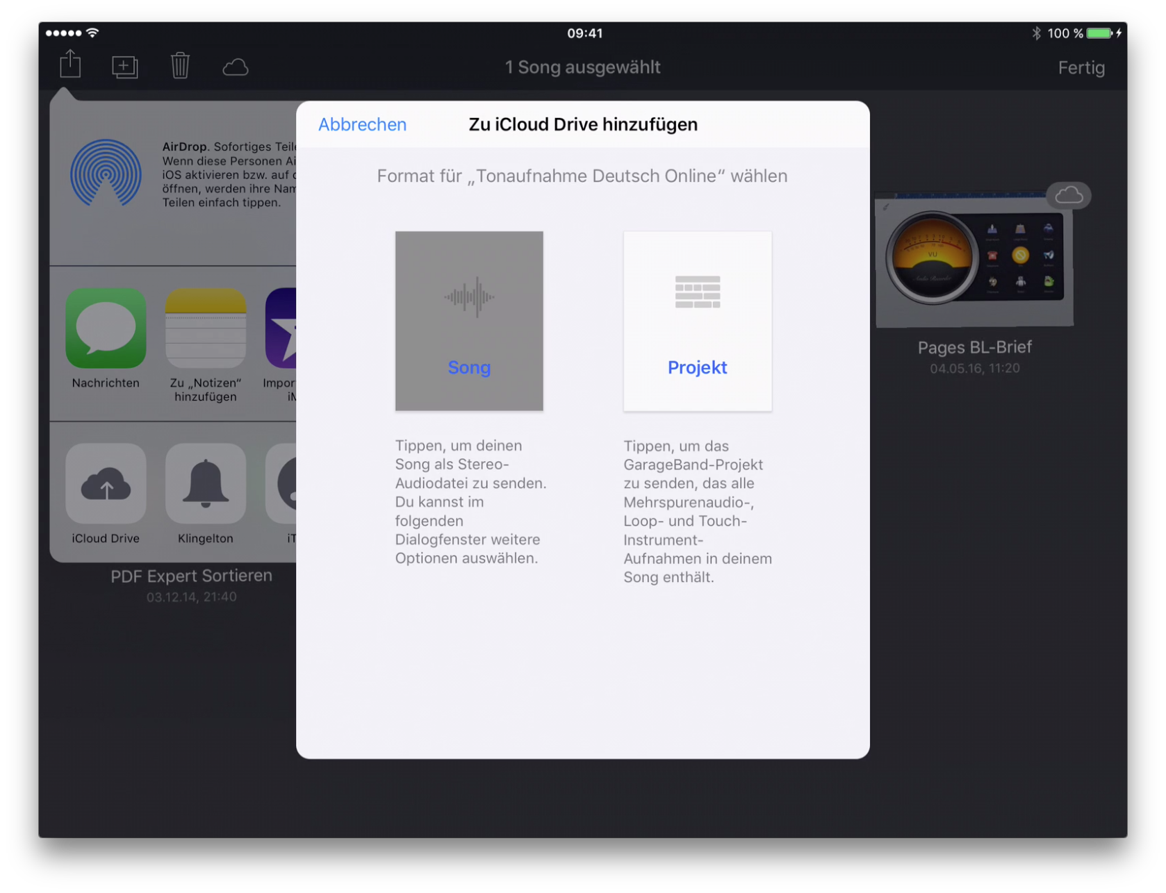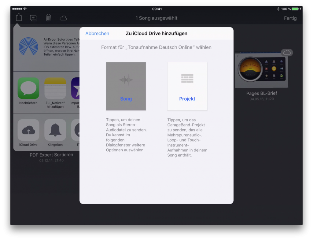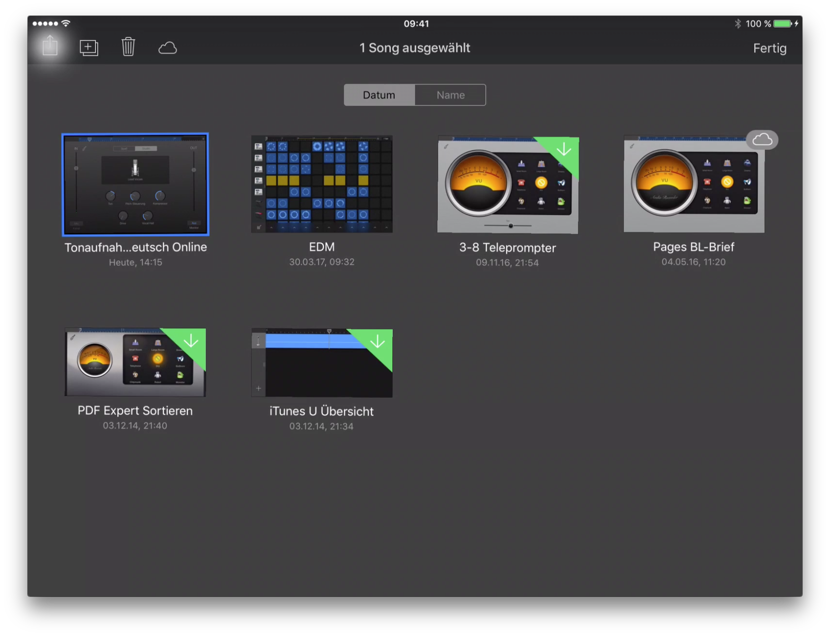 Öffne GarageBand und wähle „Neuer Song erstellen“. Die Option verbirgt sich in der linken oberen Ecke hinter dem +.Wähle oben in der Mitte des Bildschirms „Spuren“ und wische dann von rechts nach links über den Bildschirm, bis die Option „Audio Recorder“ erscheint. Wähle dann unten links „Stimme“. Damit richtet GarageBand alles optimal für eine Stimmaufnahme ein.Starte und beende deine Tonaufnahme mit dem roten Aufnahmeknopf oben in der Mitte. Wenn du fertig bist, startet automatisch die Wiedergabe, so dass du deine Aufnahme noch einmal anhören kannst. Wenn du mit dem Ergebnis zufrieden bist, tippe links oben auf „Meine Songs“, um das Aufnahmeprojekt zu schließen und in die Projektübersicht zu gelangen.Tippe in der Übersicht auf den Namen deiner Aufnahme, um ihr einen aussagekräftigen Titel zu geben. Tippe dann links oben auf das Export-Symbol (hier hervorgehoben dargestellt).Es öffnet sich ein Export-Fenster mit zahlreichen Möglichkeiten. Wähle „iCloud Drive“ unten links.Als Nächstes möchte GarageBand wissen, ob das ganze Projekt (zum Weiterbearbeiten) exportiert werden soll oder nur der fertige Song. Wähle „Song“. Danach kannst du noch Optionen wie deinen Künstlernamen verändern.