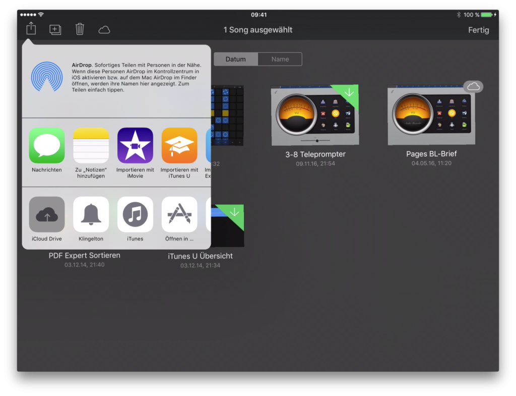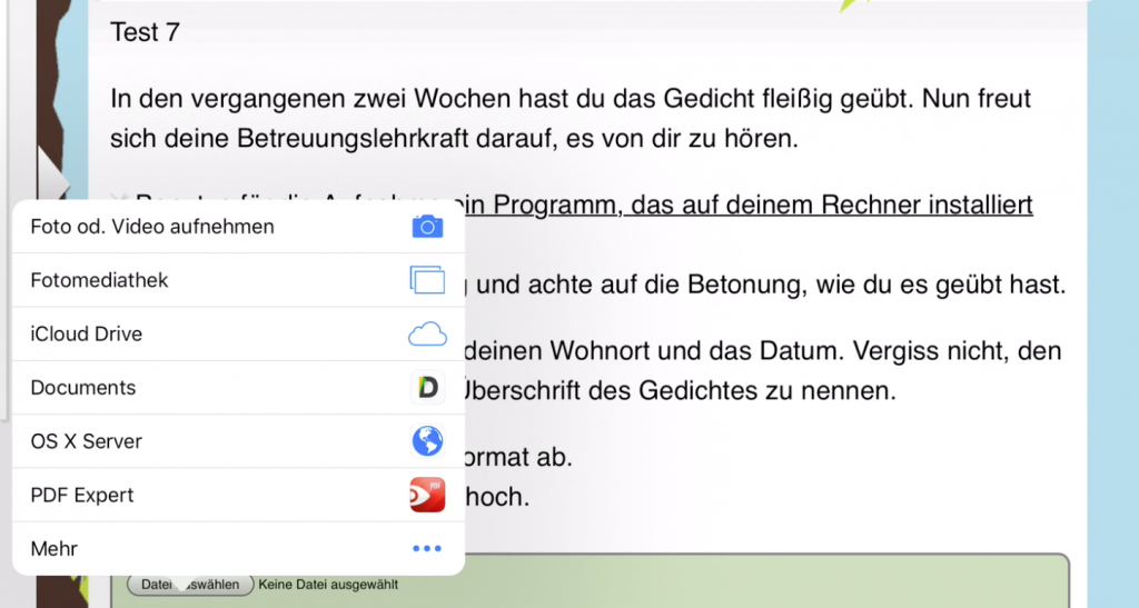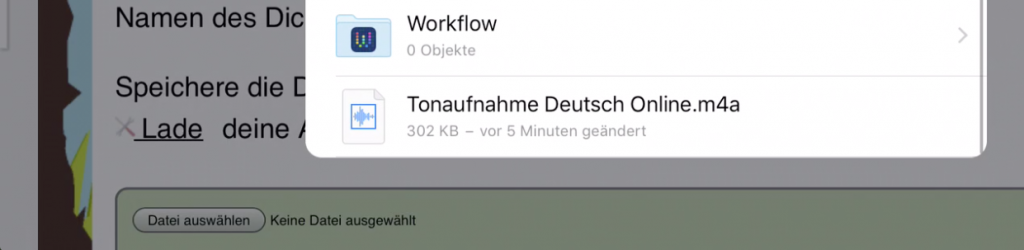 Die Tonaufnahme ist jetzt im komprimierten Mpeg4-Format („M4A“) in deinem iCloud Drive gespeichert. Auf diesen Ort kannst du mit dem iPad zugreifen, wenn du im Online-Kurs etwas hochladen sollst:
